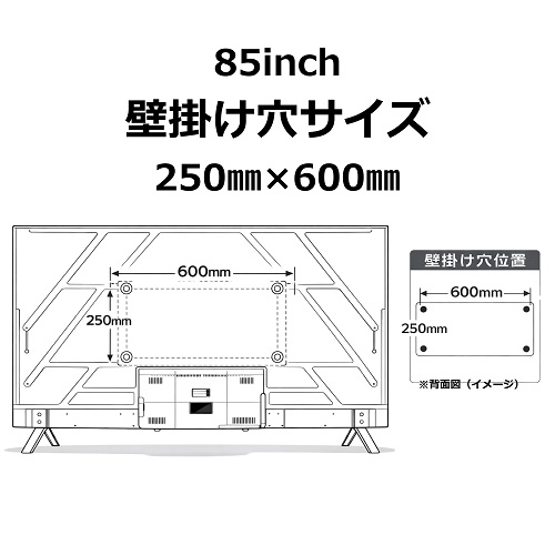 本体背面には横幅60cm、縦幅25cm(穴芯)のビス穴が設けてあり、汎用の壁掛け金具を使用して壁掛け設置をすることが可能です。